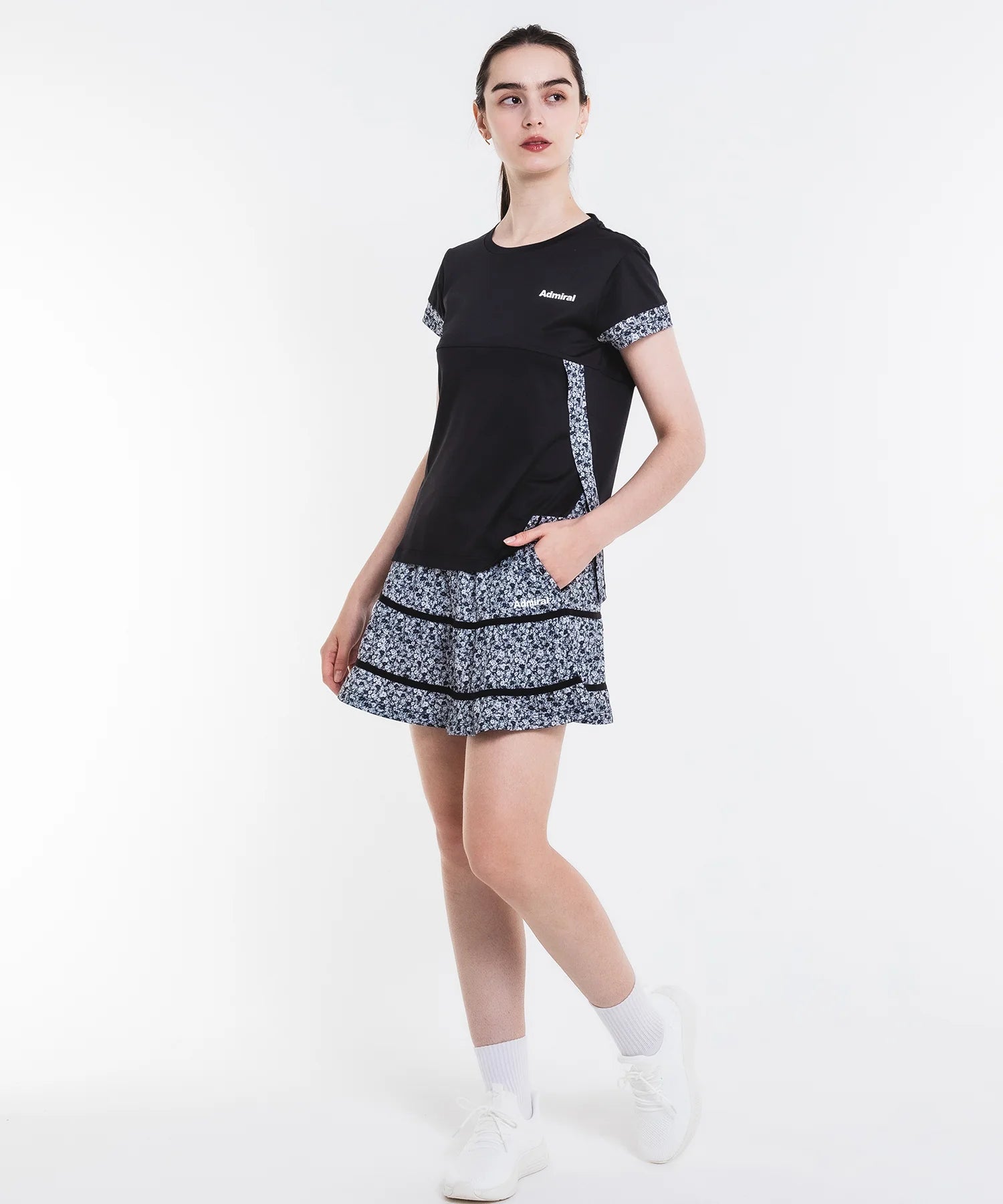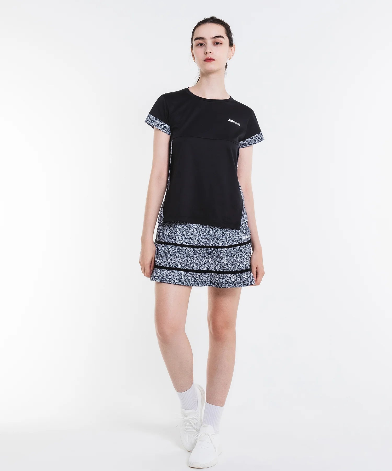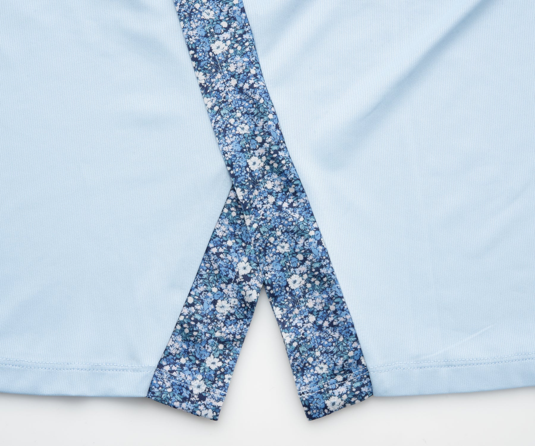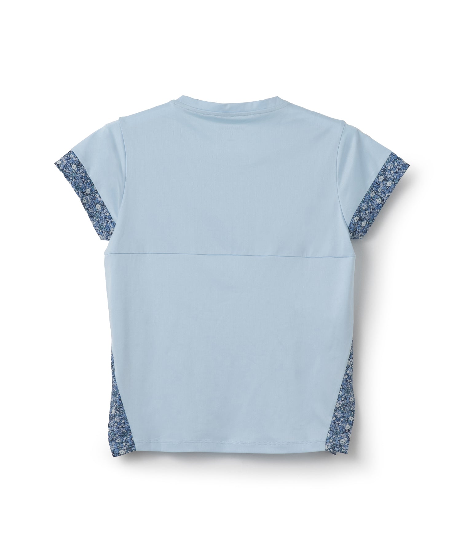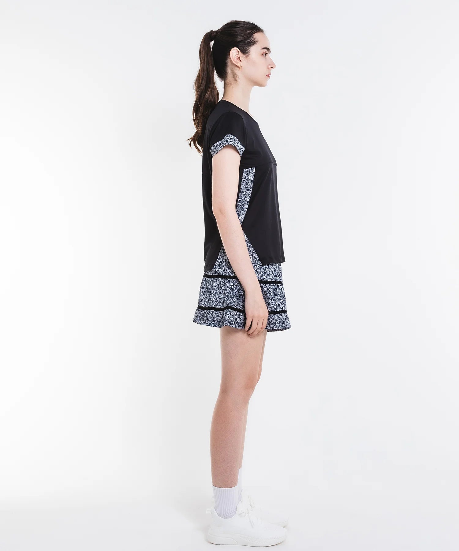 - 両脇の大胆なレイヤードスリットがデザインのTシャツ。無地ベースに切り替えた小花柄がアクセント。ソフトな風合いで上品な光沢のある細畝のカットソー素材。