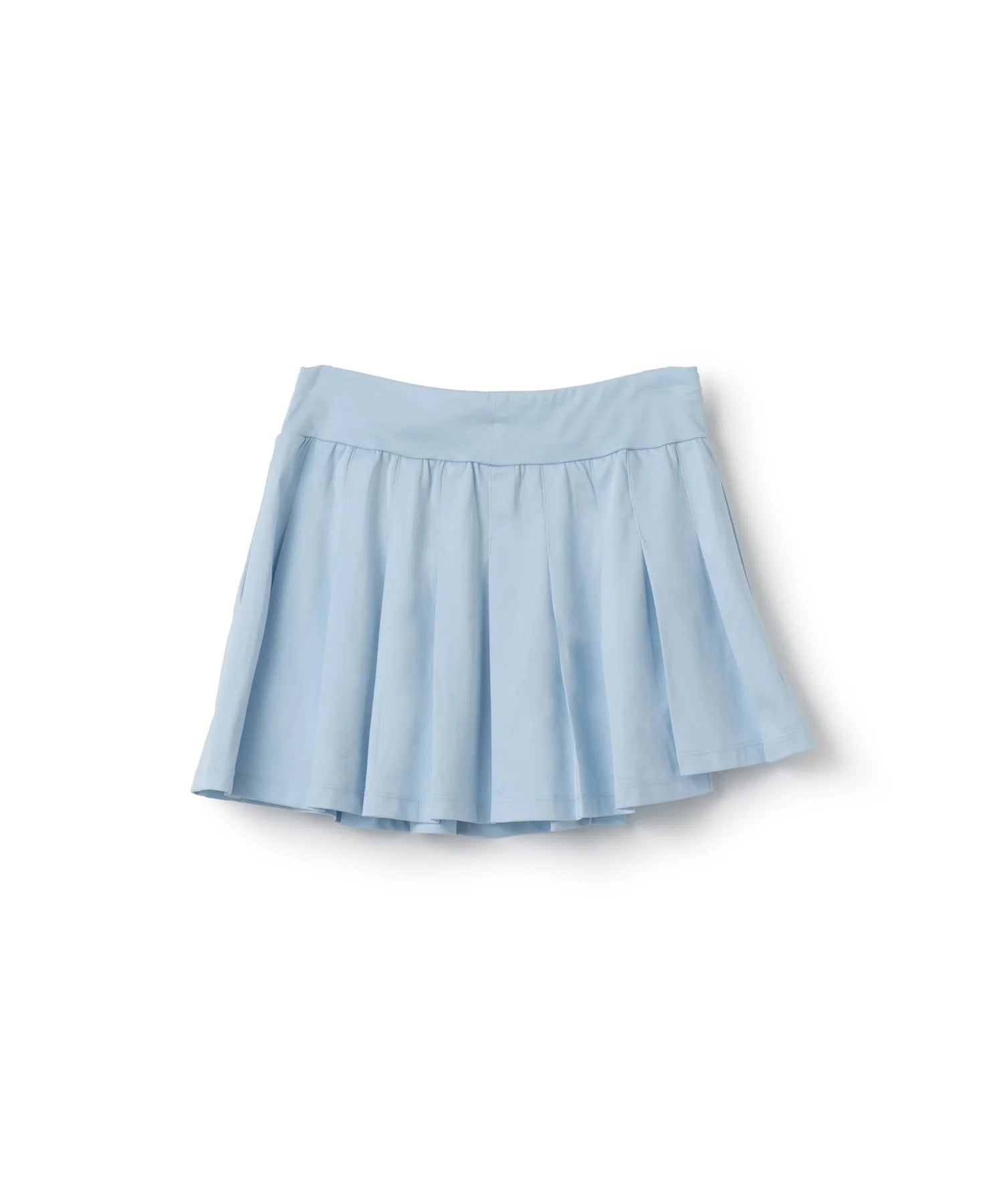 - 左右で丈差のあるアシンメトリーデザインのプリーツスコート。ソフトな風合いで上品な光沢のある細畝のカットソー素材。両脇ポケット、ウエスト紐調整有り。